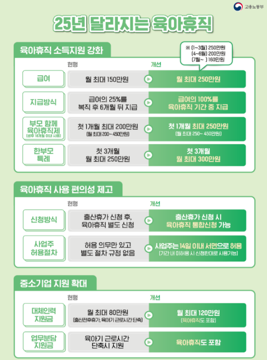 - 육아휴직 급여 인상: 육아휴직 급여는 최대 250만원으로 확대되며, 사후 지급금 제도가 폐지되어 부모들이 더욱 안정적으로 육아를 할 수 있습니다. 이전에는 육아휴직 급여가 상대적으로 적었기 때문에 경제적인 부담이 컸지만, 이제는 더 많은 지원을 받을 수 있게 되어 부모들이 더 나은 육아 환경을 조성할 수 있습니다.