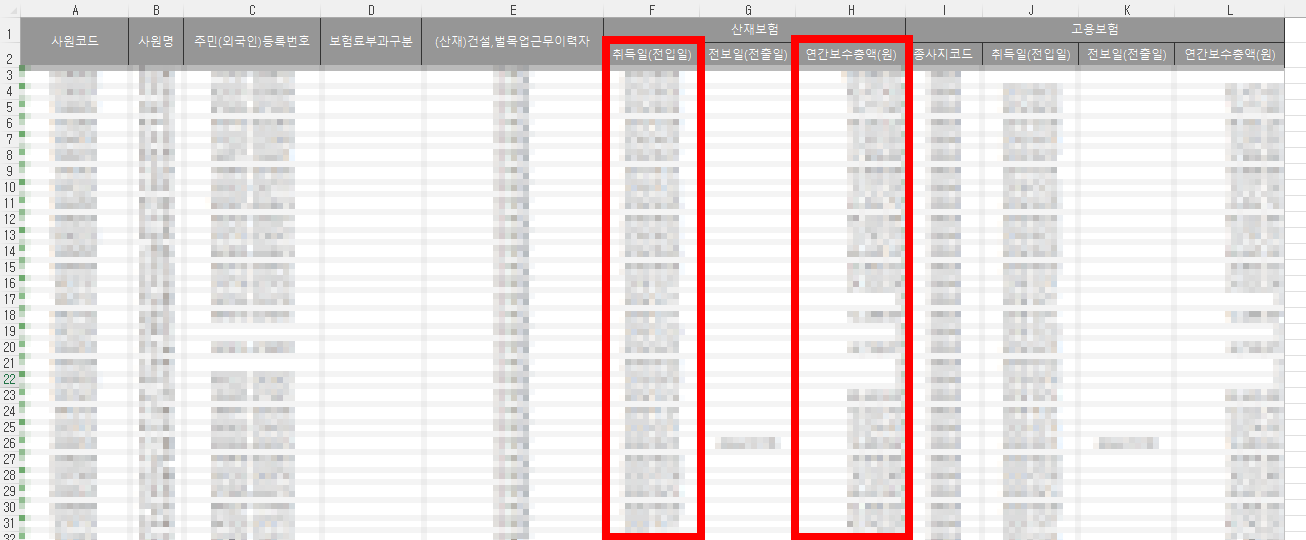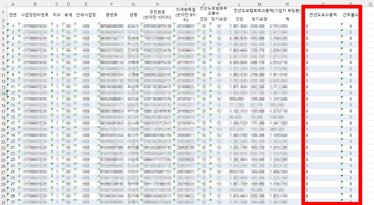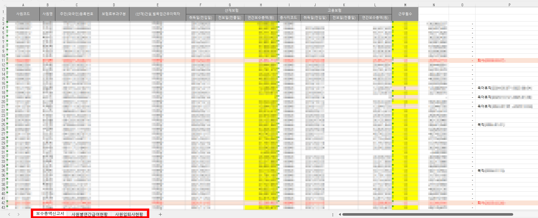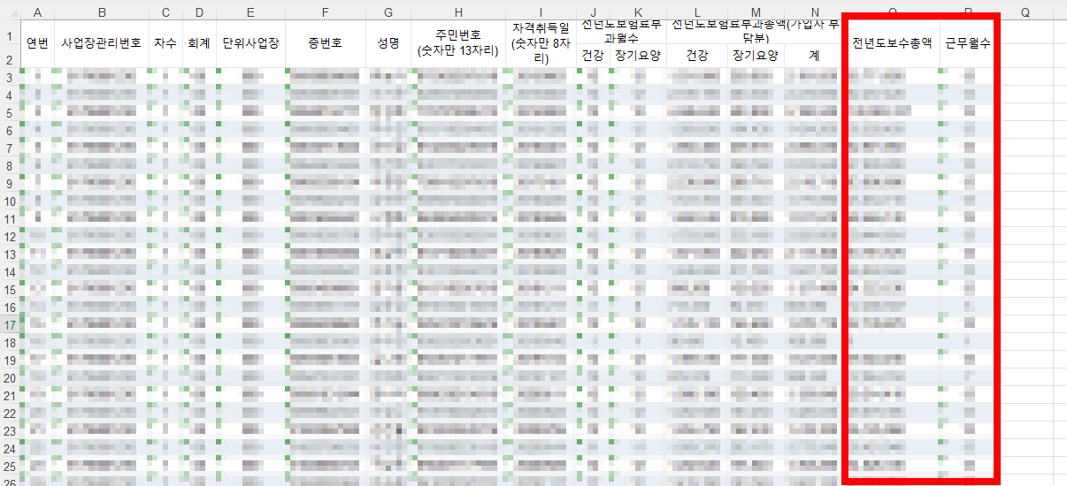 - 해당 엑셀 파일에는 명단, 보험료 내역 등의 정보와 함께 전년도보수총액 및 근무월수 열이 나옵니다.