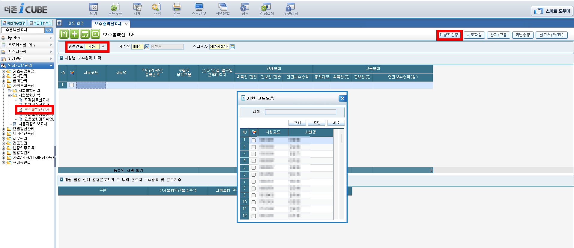 - 더존ICUBE를 이용하여 기초자료를 확인해주기 위해 [보수총액신고서]를 클릭합니다.