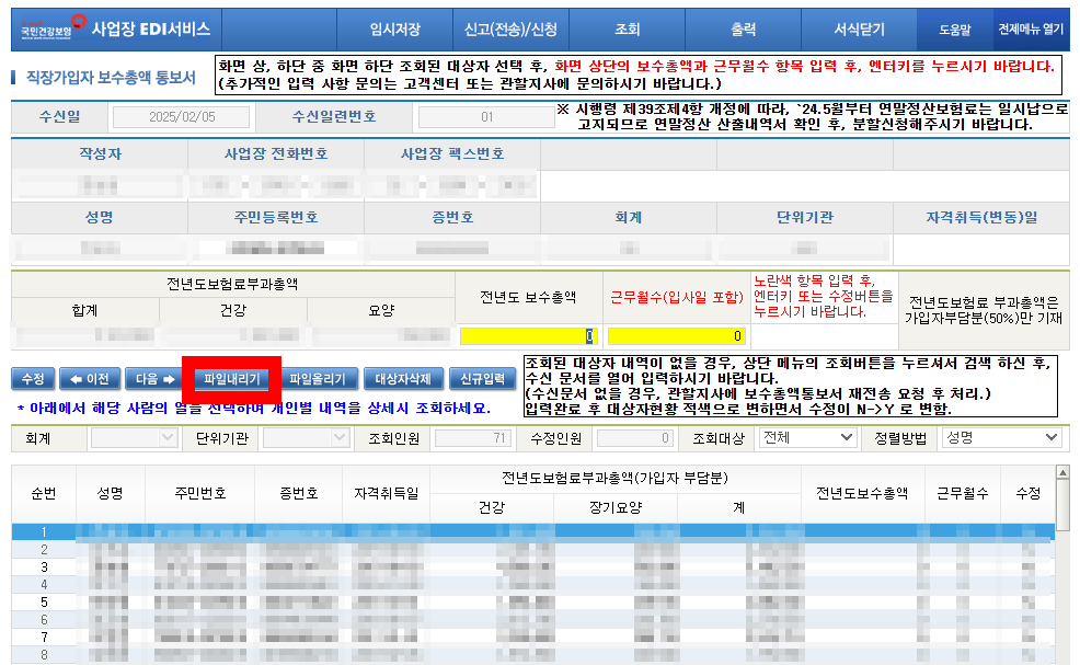 - [직장가입자 보수총액 통보서]에 들어가서 [파일내리기]를 선택합니다.
