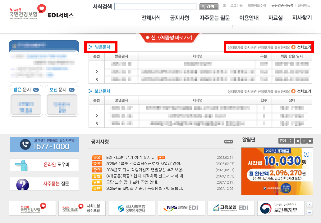 먼저, 건강보험EDI 시스템에 로그인 후, [받은 문서] 메뉴로 들어갑니다.