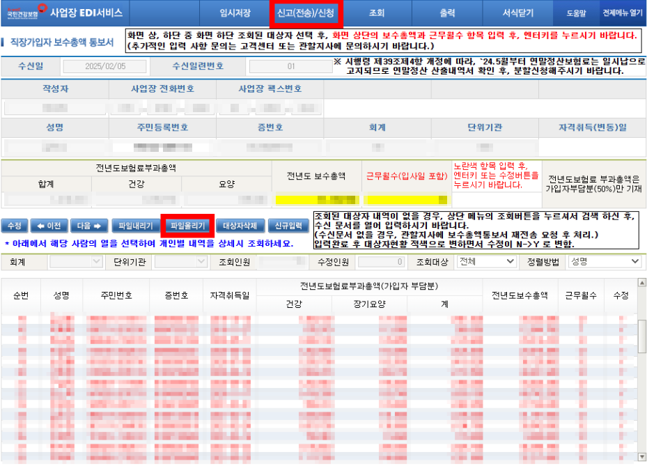 - 건강보험 EDI에서 [직장가입자 보수총액 통보서]로 다시 가서 [파일올리기]를 선택하고, 작성한 자료를 업로드합니다