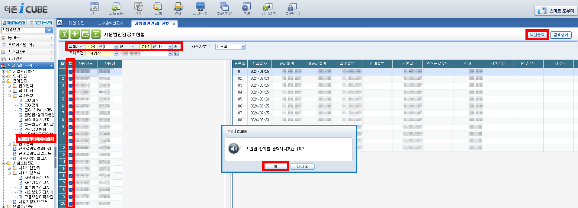 - [사원별연간급여현황]에 들어가서 우클릭 후 [데이터변환- 엑셀출력]을 선택하고, [사원별 합계]로 출력을 진행합니다.