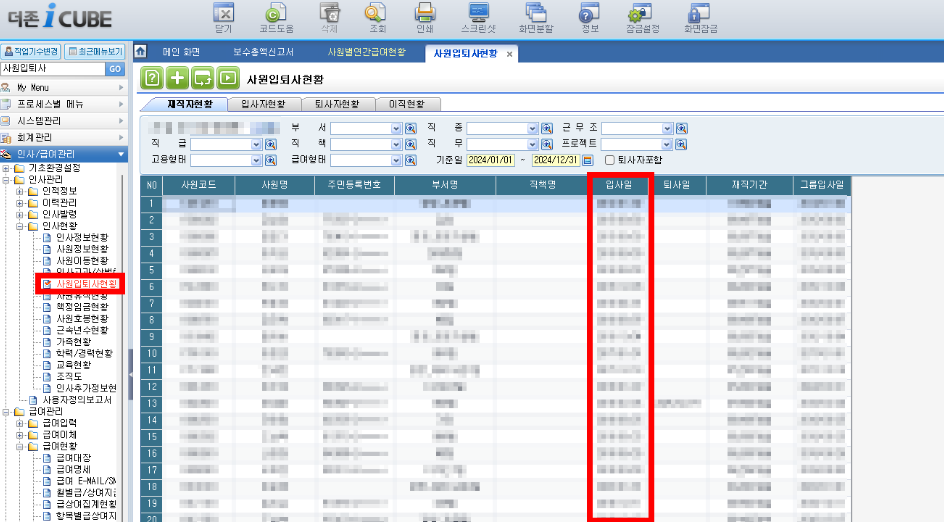 - [사원입퇴사현황]에서 [재직자현황]을 조회하여, 자료를 엑셀로 가져옵니다.