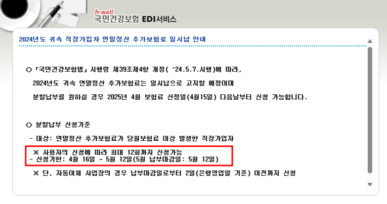 연말정산 착오자 변경 신고 최대 12회 분할납부 원할 경우 신청 (사업장▶공단) |