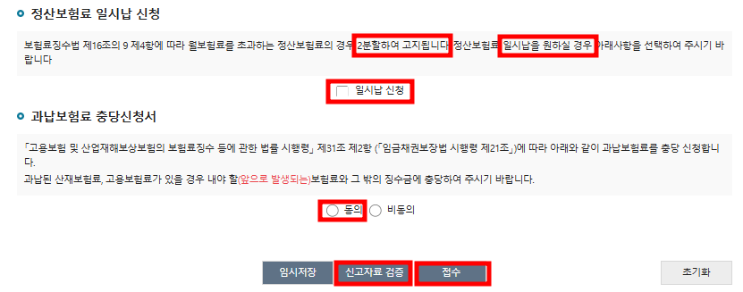 - [과납보험료 충당신청서]에서 충당 여부를 체크한 후, [임시저장] → [신고자료 검증] → [접수]를 차례대로 선택합니다.