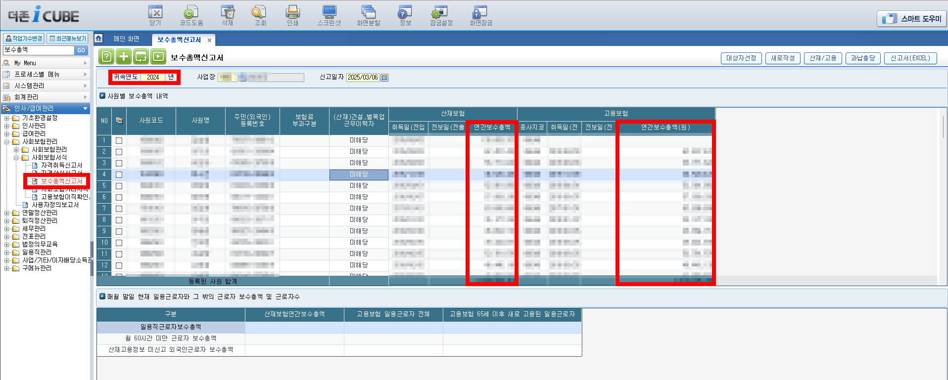 - 보수총액을 입력하려면 ICUBE [보수총액신고서]에서 [대상자선정]을 선택하여 조회합니다.