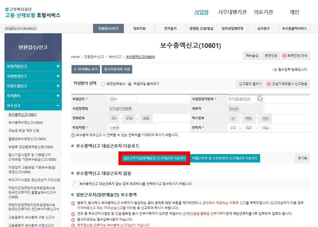 [보수총액신고]에서 [사업장관리번호]를 선택해 조회한 후, [일반근로자(일반예술인) 신고대상자 다운로드]를 클릭하여 엑셀을 다운로드 합니다.